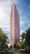 Внутреннее пространство жилого комплекса ориентировано на создание благоприятной городской среды: на стилобатной части здания разместятся коммерческие и общественные пространства, включая кафе, магазины, сервисные точки и зону отдыха на эксплуатируемой крыше. Такой подход обеспечивает удобство проживания, позволяя решать повседневные задачи, не покидая территории комплекса. Закрытая территория, система безопасности, подземный паркинг и премиальные входные группы дополняют образ современного жилого небоскреба.