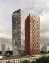 Жилой корпус отличается динамичной формой фасада с панорамными эркерами, которые увеличиваются в размерах к верхним этажам, создавая эффект постепенного раскрытия и визуального движения. Офисная башня выполнена в виде лаконичного стеклянного кристалла, символизирующего технологичность и престиж деловой среды. Оба здания объединены общим стилобатом, в котором разместятся коммерческие помещения, сервисные зоны и объекты инфраструктуры. На эксплуатируемой крыше стилобата появится зеленая зона отдыха с видами на столичный горизонт.